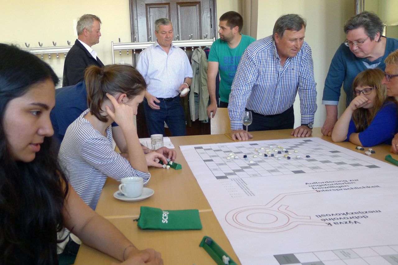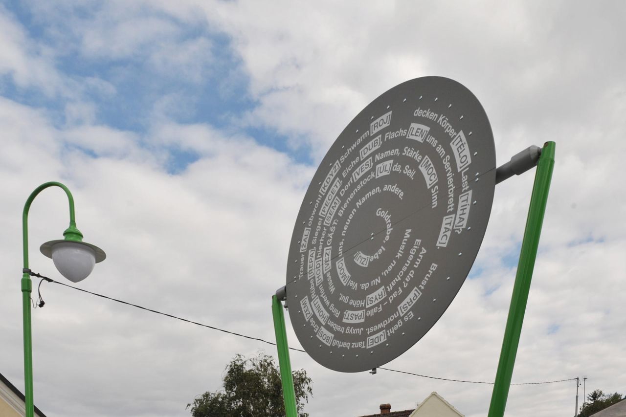 Previous to the design of the square a collective event took place in May 2016: a bilingual Scrabble game. The word creations served as basis for a text piece by transparadiso which will be installed on a rotable disk as major element of a seating-table-sculpture which defines the square. This disk is a signifier for the cross-border neighborship and in its horizontal position serves as roof providing shadow. The sculpture creates a space for inhabitation, which is complimented by planting a tree and installing a lamp typical for the region and the neighboring Czech villages Nový Přerov and Březí. In order to link the two parts of the square a speed reduction of 30 km/h could be obtained in cooperation with the government of Lower Austria.