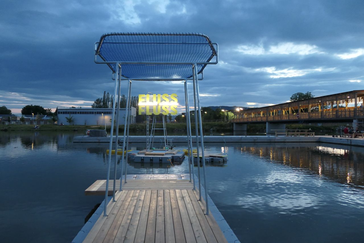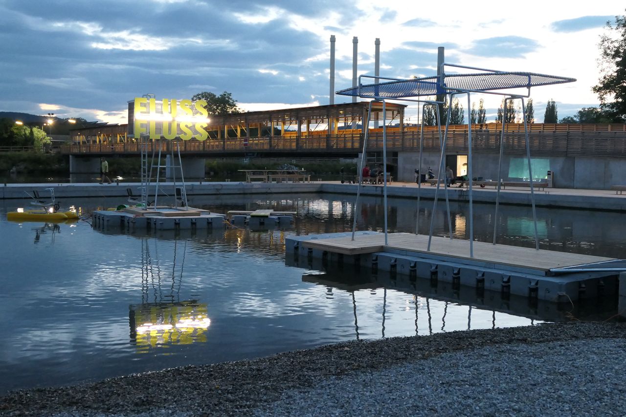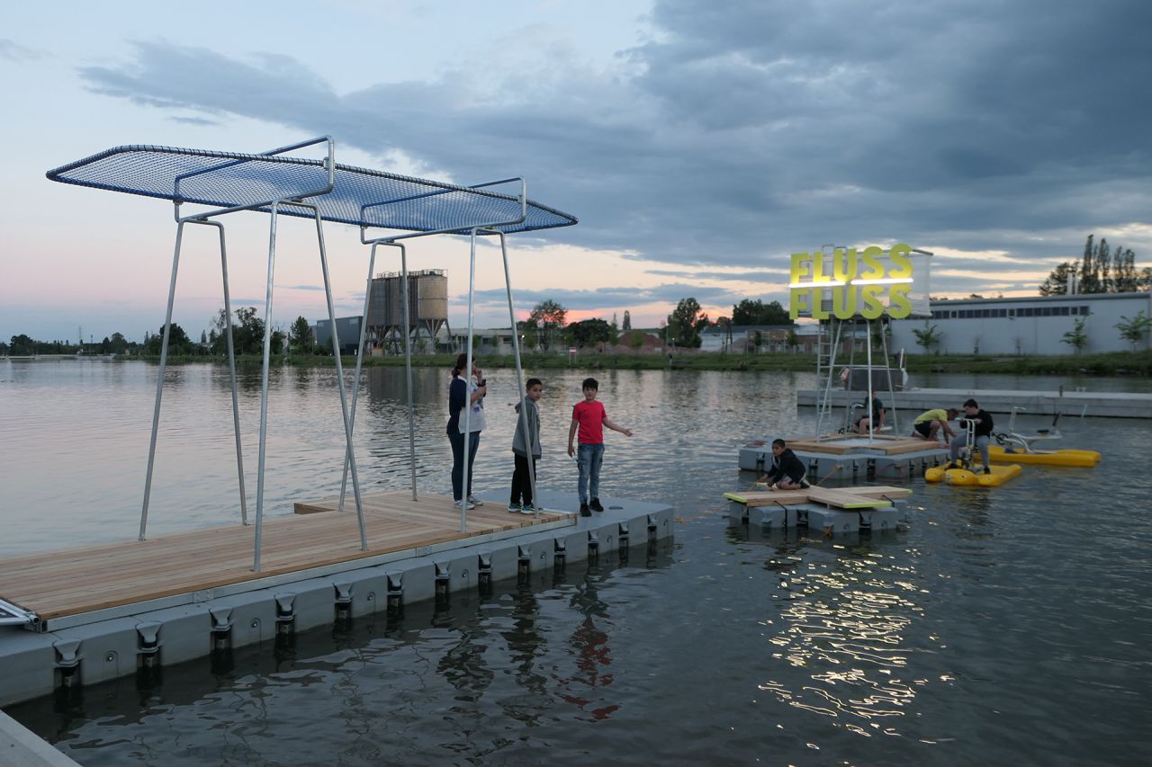 Eine Boje mit dem Schriftzug FLUSSFLUSS wird zum Start des Projekts im Wasser auftauchen und die kollektive Aneignung des Ortes signalisieren. Dazu wird eine überdachte Platform für die Aneignung durch die Bevölkerung als permanenter öffentlicher Ort zur Alltagsnutzung und für weitere Veranstaltungen verankert. Bereits die Bauphase wird von orizzontale zur informellen Beteiligung genutzt, um aktuelle Fragestellungen der Gesellschaft und Stadtentwicklung in Wechselwirkung mit ökologischen Themen zu adressieren.