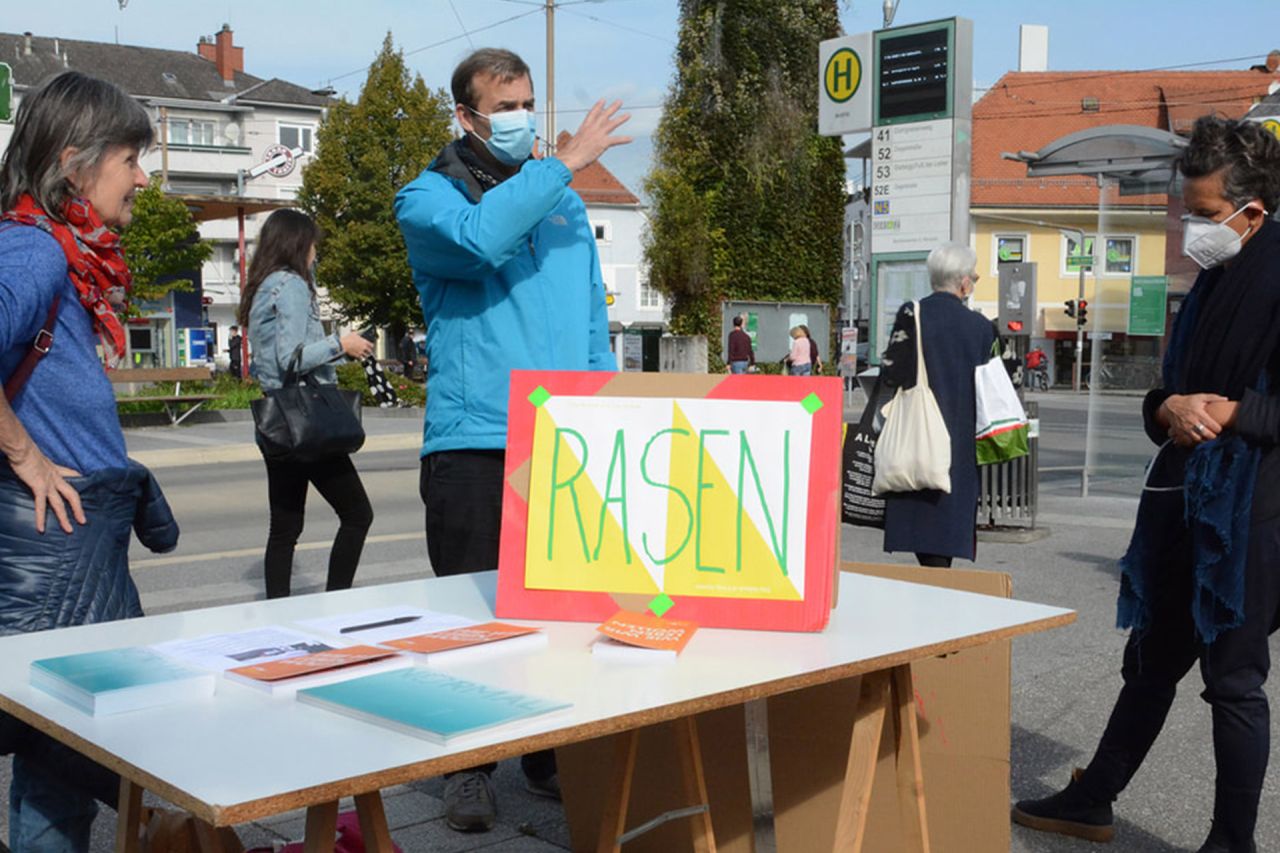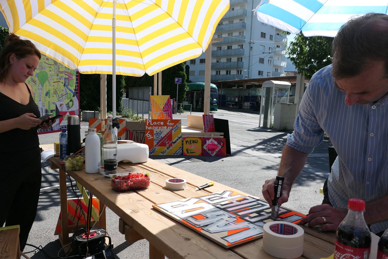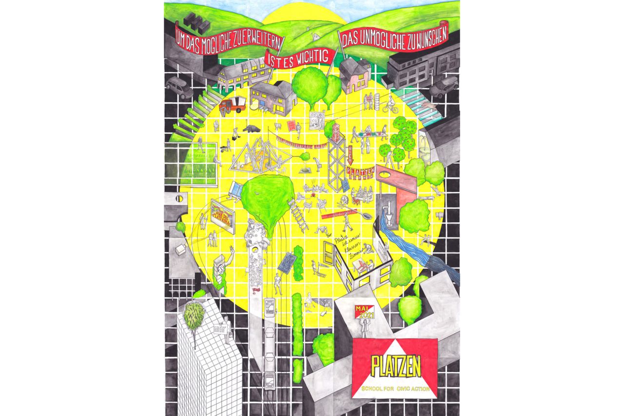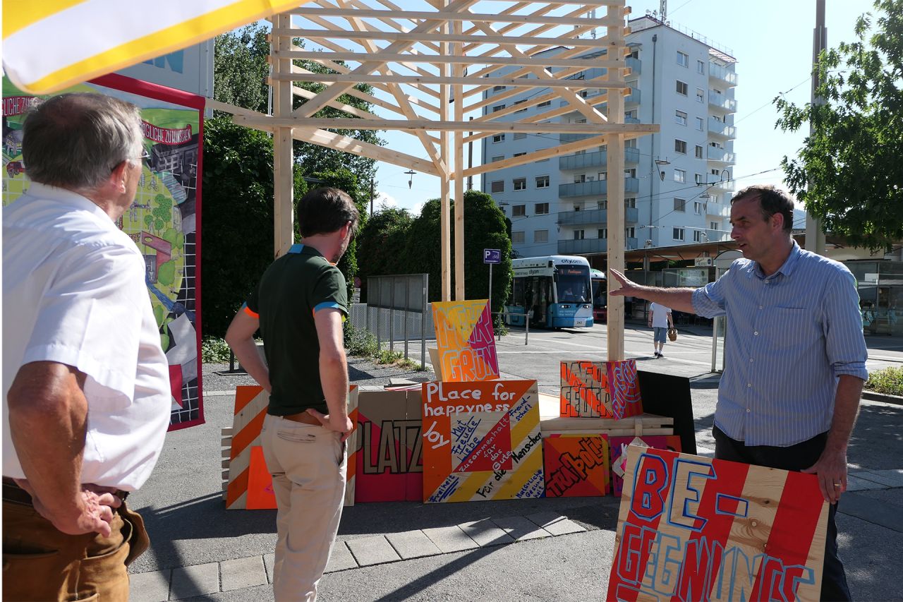 PLATZEN - School for Civic Action wird am Hauptplatz Andritz von 14.7.-18.7.2021 realisiert, um eine neue Programmierung für diesen von Verkehr bestimmten Platz zu diskutieren.