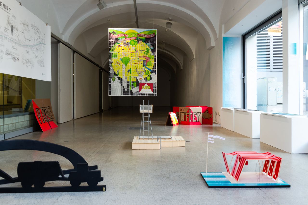 In der Ausstellung im HDA Graz wurden Themen für PLATZEN, die public works u.a. bei ihrer ersten Intervention im Oktober 2020 gesammelt hat, präsentiert. Die Themen wurden hier bereits in einen weiteren Kontext eingebettet, in dem die spezifische Situation von Andritz mit Superstudio und anderen Referenzen verknüpft wurde.