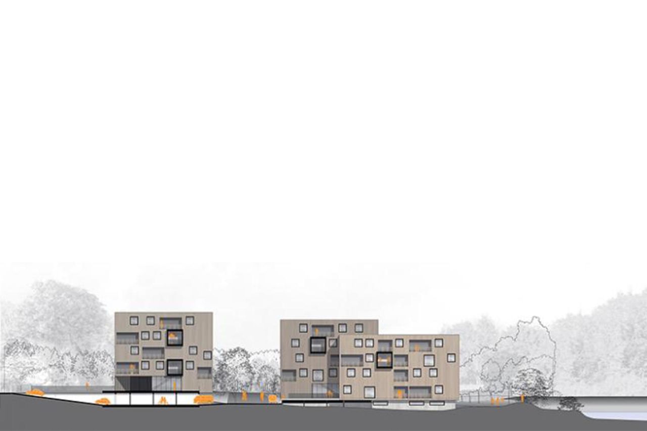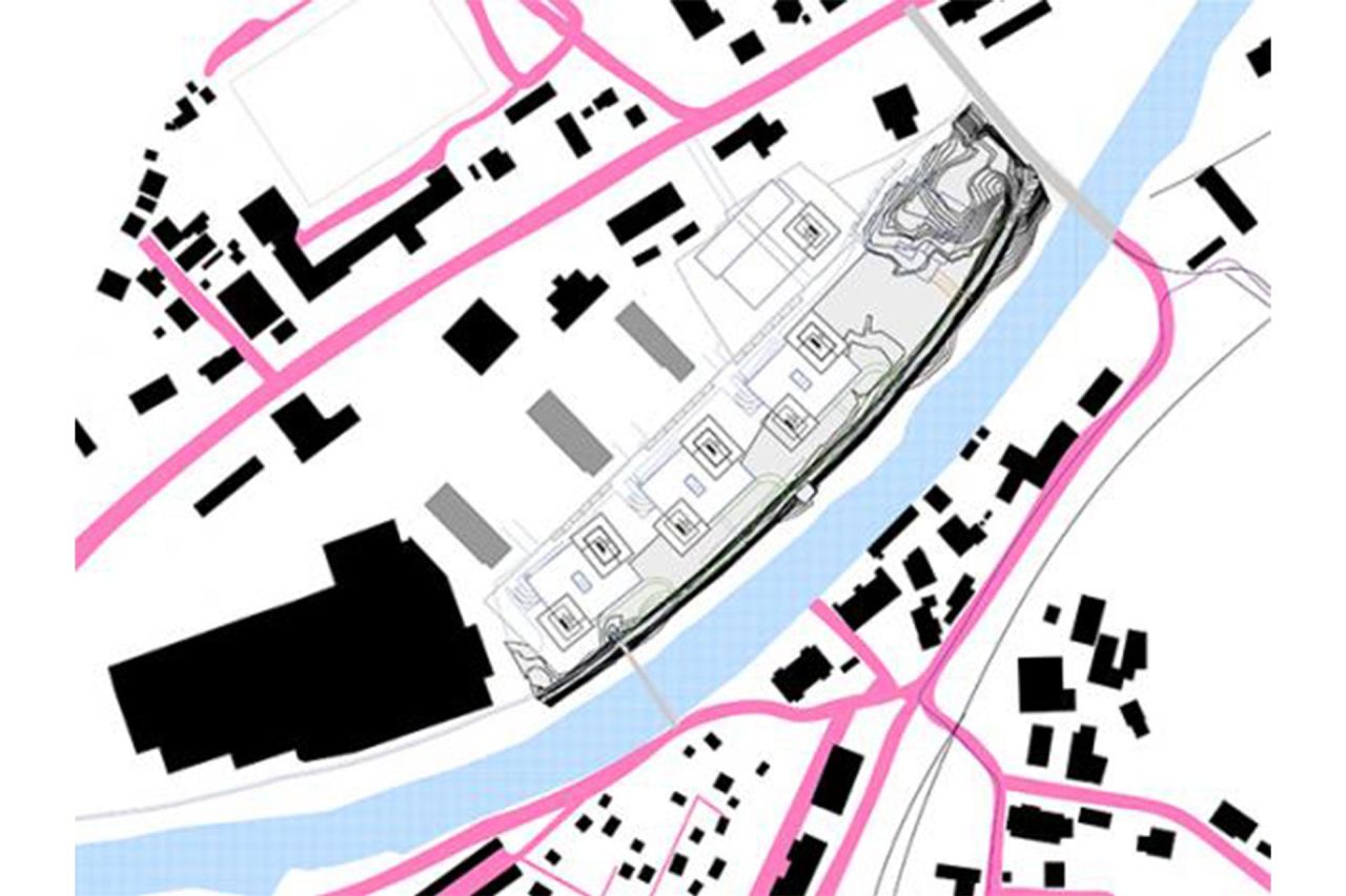 Das Bebauungskonzept reagiert auf den Bestand mit punktförmigen, leicht versetzten Baukörpern, die jeweils paarweise auf einer leicht erhöhten Platte sitzen und einen clusterförmigen Bauabschnitt über je einer natürlich belichteten Tiefgarage definieren. Die Bebauung schafft eine hohe Durchlässigkeit zur Mürz hin - auch für die im Nordwesten liegenden Bestandsbauten, wobei die Dimensionierung der Baukörper zwischen Altbestand und Einkaufszentrum (Spar) im Westen vermittelt. Die feine Modellierung der bestehenden Topographie mit dem Damm zur Mürz bleibt weiterhin spürbar.