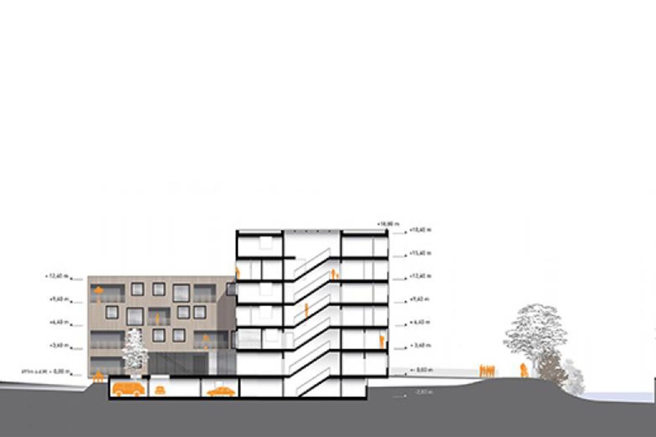 Das Material Holz wird nicht nur für die weithin sichtbare, hinterlüftete Fassade sondern auch strukturell für das gesamte Projekt vorgeschlagen. So basiert die Grundkonstruktion auf querschicht-verleimten Platten, die sowohl als Decken- als auch als Wandscheiben eingesetzt werden.