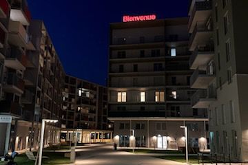 The BIENVENUE neon sign is located in the center of this new quarter as highly visible symbol of the social commitment that underpins the concept for "Quartier Bienvenue" which was conceived by transparadiso: For welcoming, for togetherness, for mutual exchange between residents of different backgrounds and their various cultures.