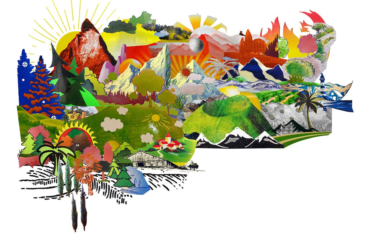 Wie aus einem Comic vermittelt das Bild scheinbar eine bunt-fröhliche Szenerie. Über die Collage kommt es zu surreal wirkenden Kombinationen - eine Schafherde steht unter einer Kokospalme, ein Gletscher wird von einem Apfelbaum beschattet und mehrere Sonnen bescheinen die Hänge. Romantisierende, sehnsüchtige Landschaften die auf den Konsumartikeln abgebildet sind, werden in ihrer Zusammenstellung zu einer Supernatur, voll mit eindrucksvollen Sonnenuntergängen, kleinen Dörfern, waldreichen Hängen, Palmenstränden und mächtigen Gletschern. Die idealisierenden Naturdarstellungen wirken in ihrer Masse unheimlich, die utopische Landschaft könnte in ihren Details und unlogischen Kombinationen auch dystopisch gelesen werden.