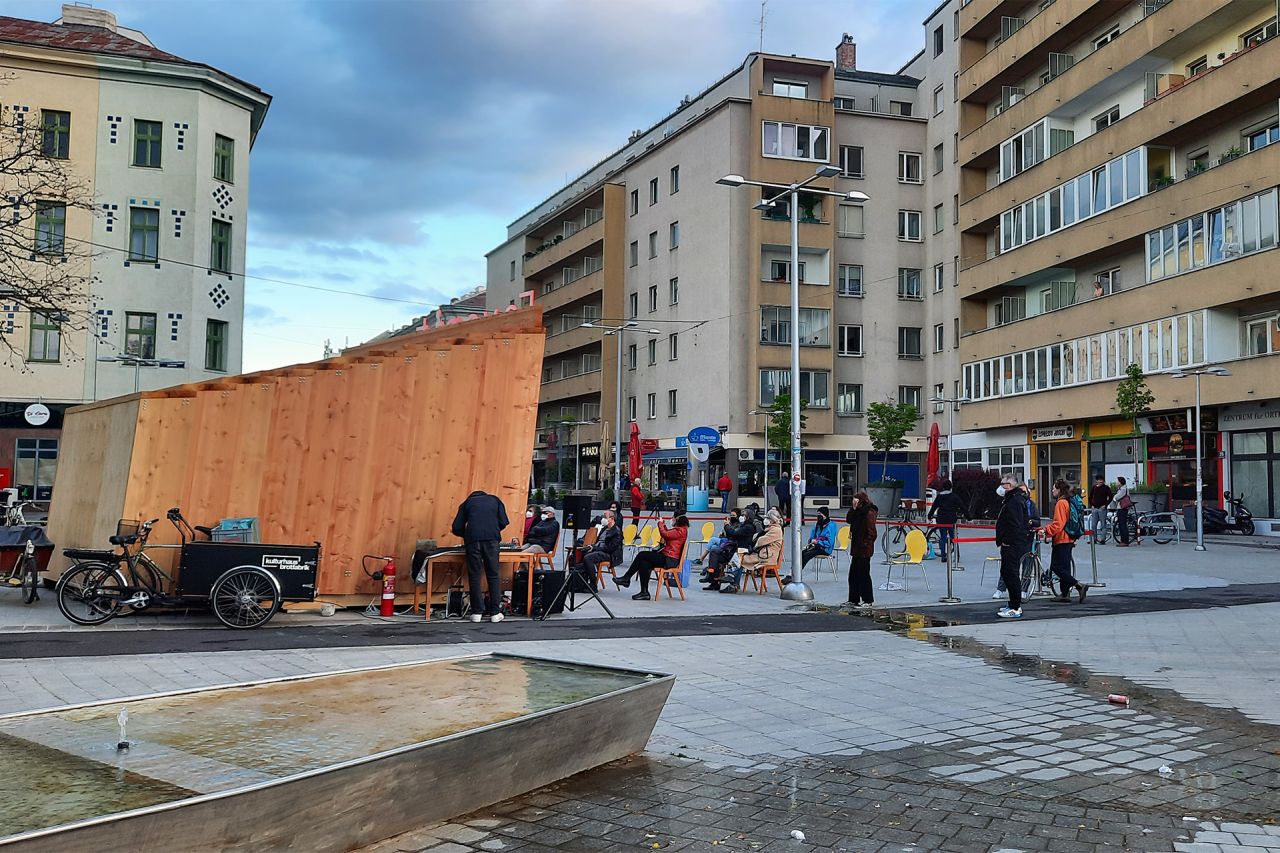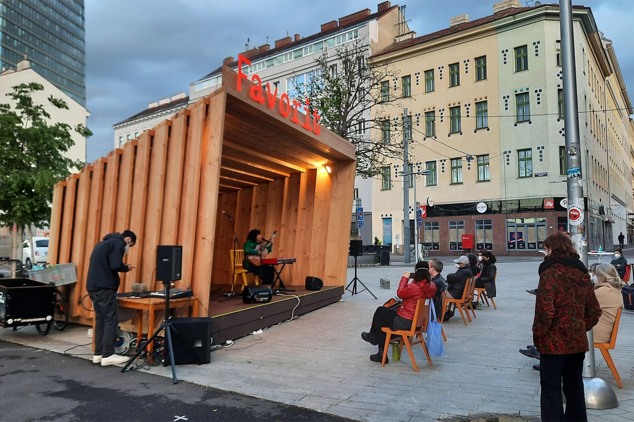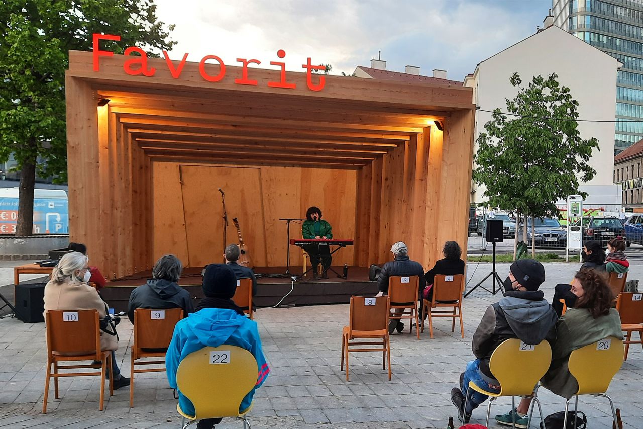 FAVORIT ist eine informelle Pavillon-Bühne zwischen „Hochkultur“ und „Volkskultur“. Von Mitte Mai bis Ende September 2021 steht die Bühne am Sonnwendplatz/ am Beginn der Fußgängerzone Favoritenstraße (U-Bahnstation Hauptbahnhof) den AlltagsnutzerInnen sowie allen noch unentdeckten Talenten oder bereits bekannten Künstler*innen sowie Vereinen verschiedenster Sparten für Performances zur Verfügung.
