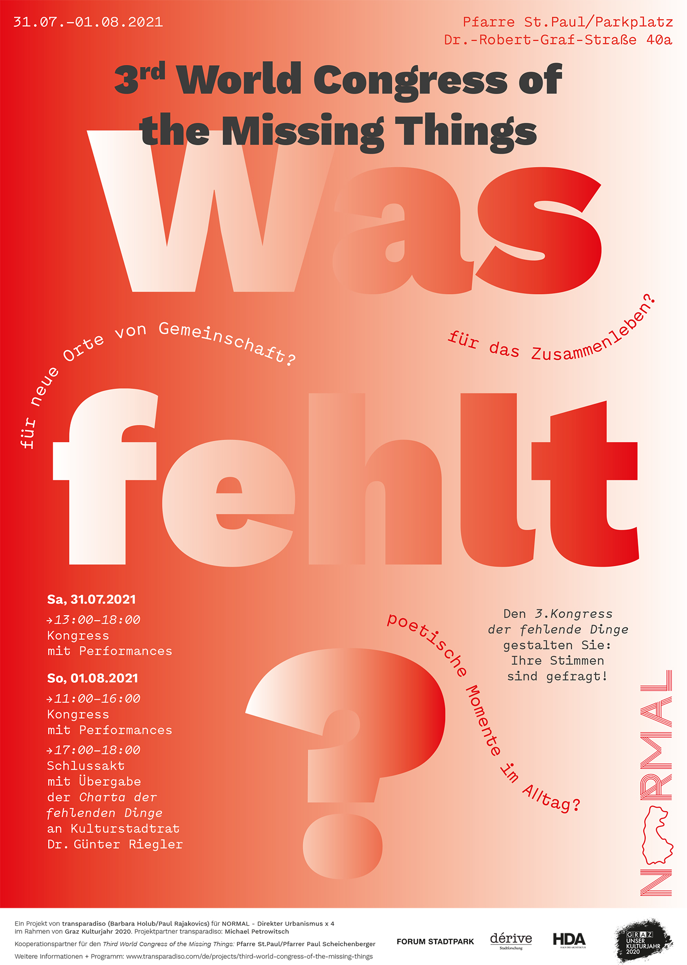 Von 31.Juli bis 1.August 2021 verwandelte transparadiso den Parkplatz der Pfarre St. Paul in der Eisteichsiedlung in Waltendorf in ein informelles Kongresszentrum für den Third World Congress of the Missing Things (in Kooperation mit der Pfarre St. Paul).