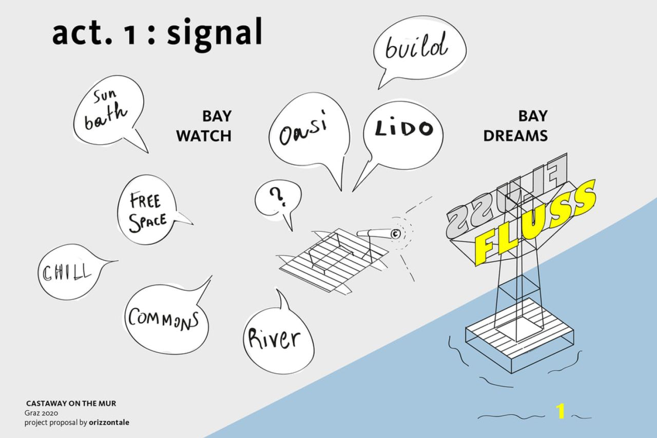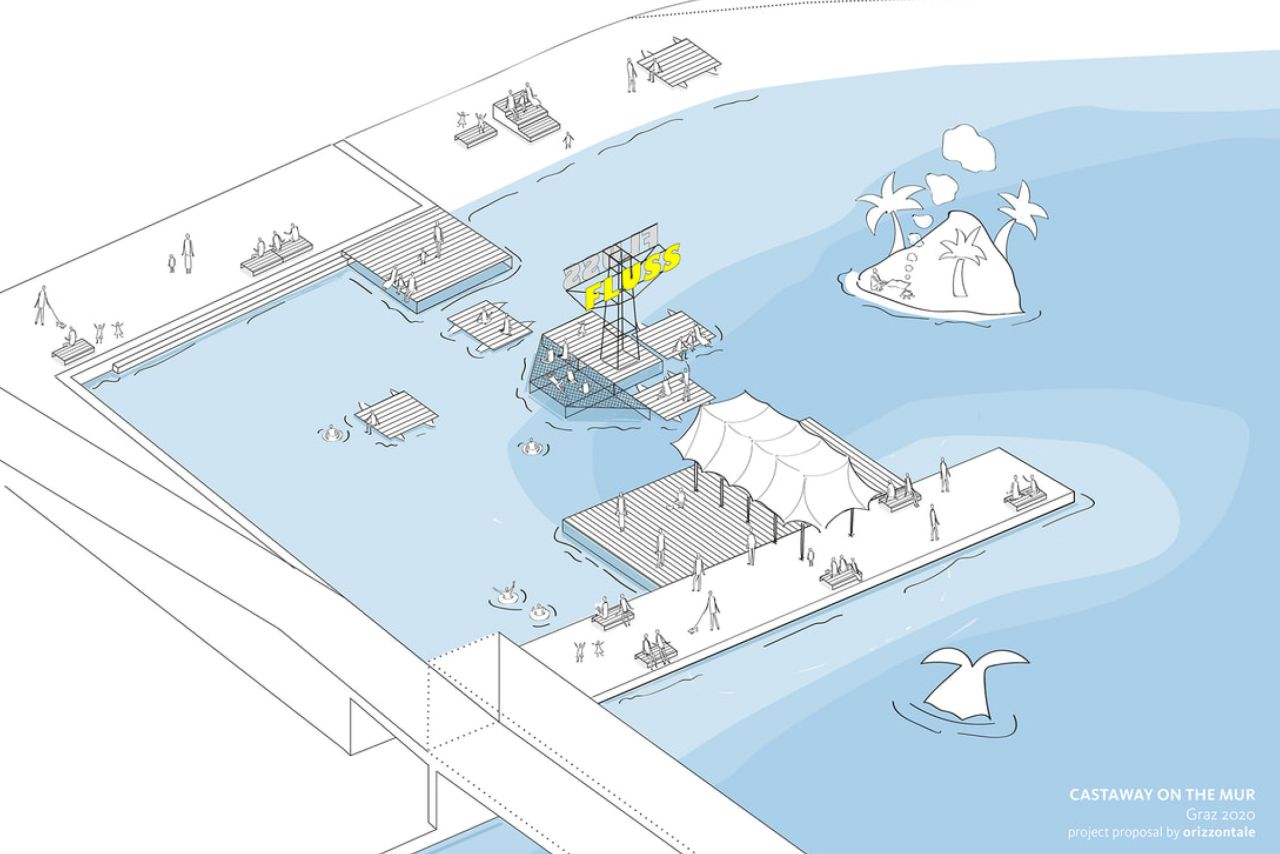 On the new beach at Grünanger in Liebenau, orizzontale will realise FLUSSFLUSS - Castaway on the Mur in May/ June 2021 (in cooperation with the Grünanger Youth Centre): “Residents are invited to dream together and build a floating system of platforms.”