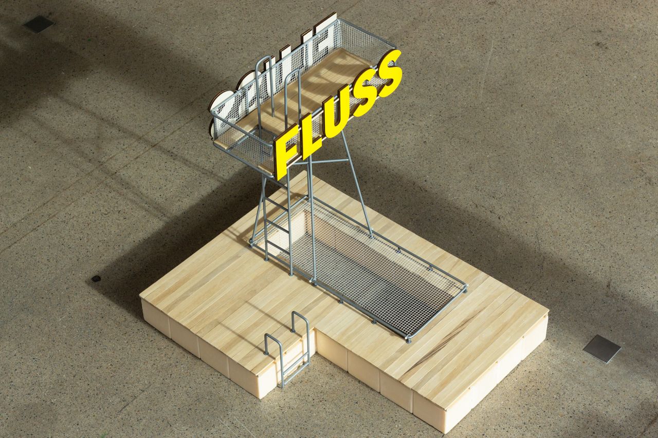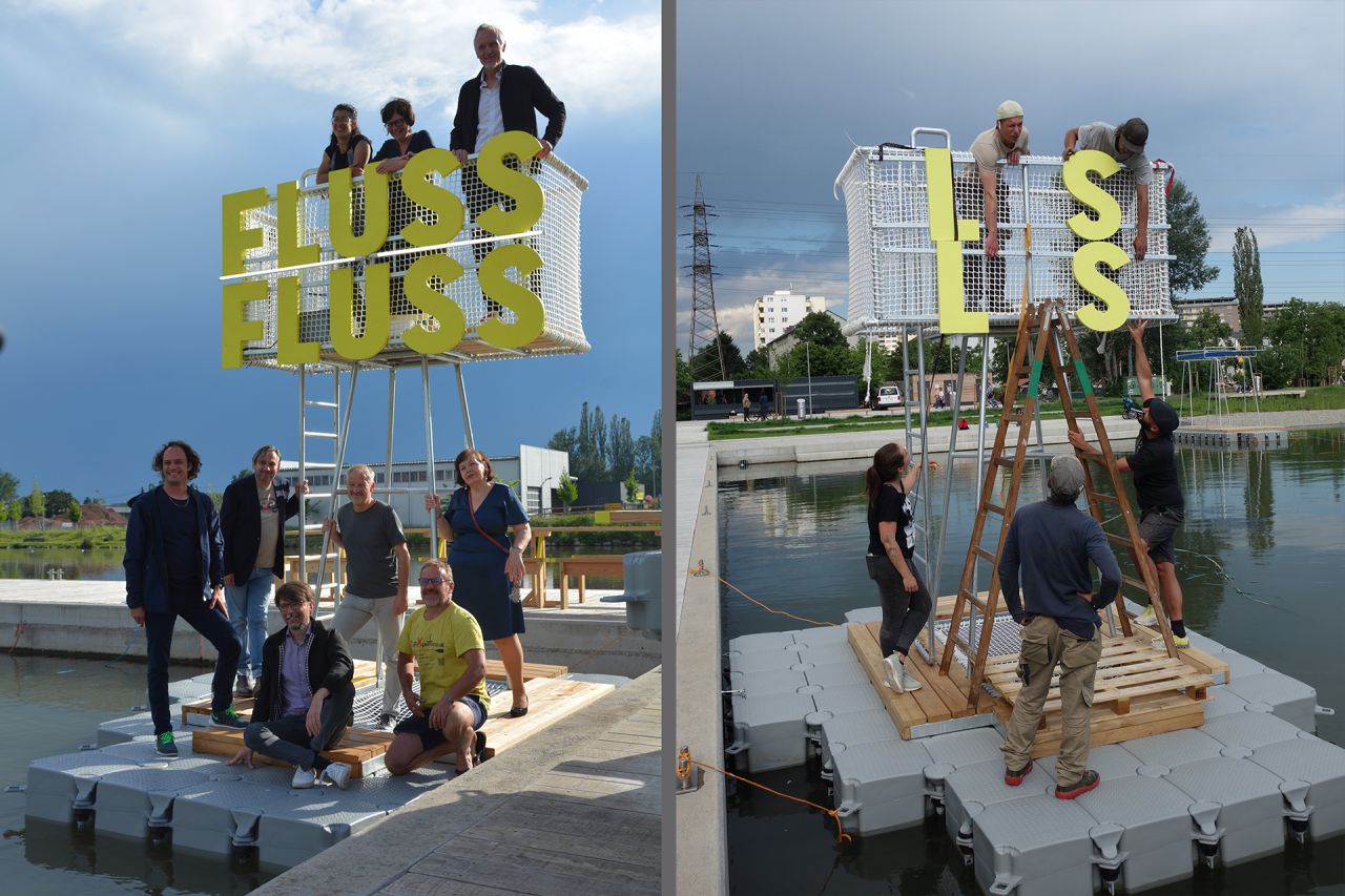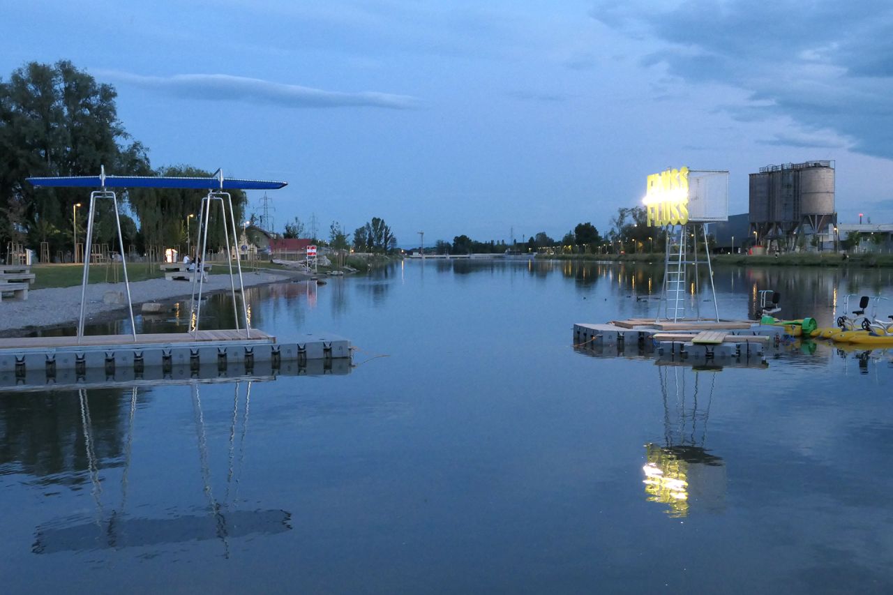 A buoy with the lettering FLUSSFLUSS will appear in the water as signal for the collective activation of the site. In addition, a covered platform for appropriation by the population will be established as a permanent public place for further events and everyday use. The construction phase is offered by orizzontale for informal participation, in order to discuss current issues of society and urban development connecting to ecological topics.