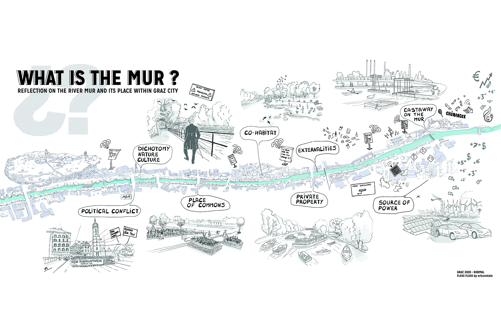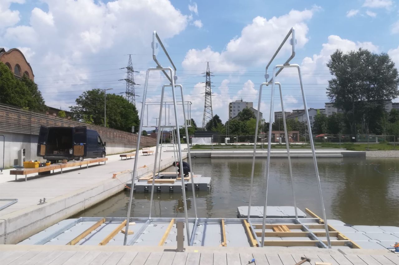 After heated discussions and protests against the Mur power plant and the resulting transformation of the landscape space the new beach has now been realized at Grünanger, providing new qualities for the residents. The neighborhood is thus undergoing a process of transformation, which orizzontale takes up with their project FLUSSFLUSS making