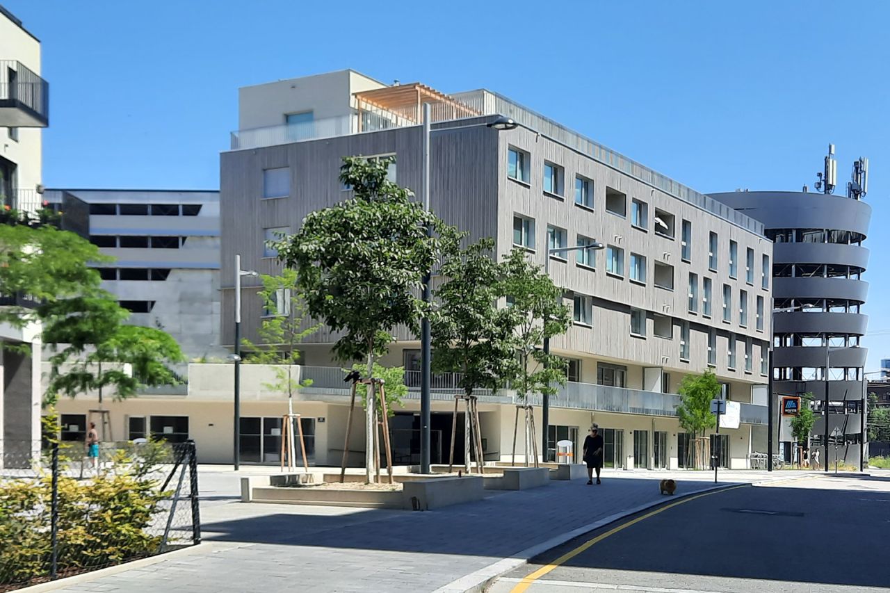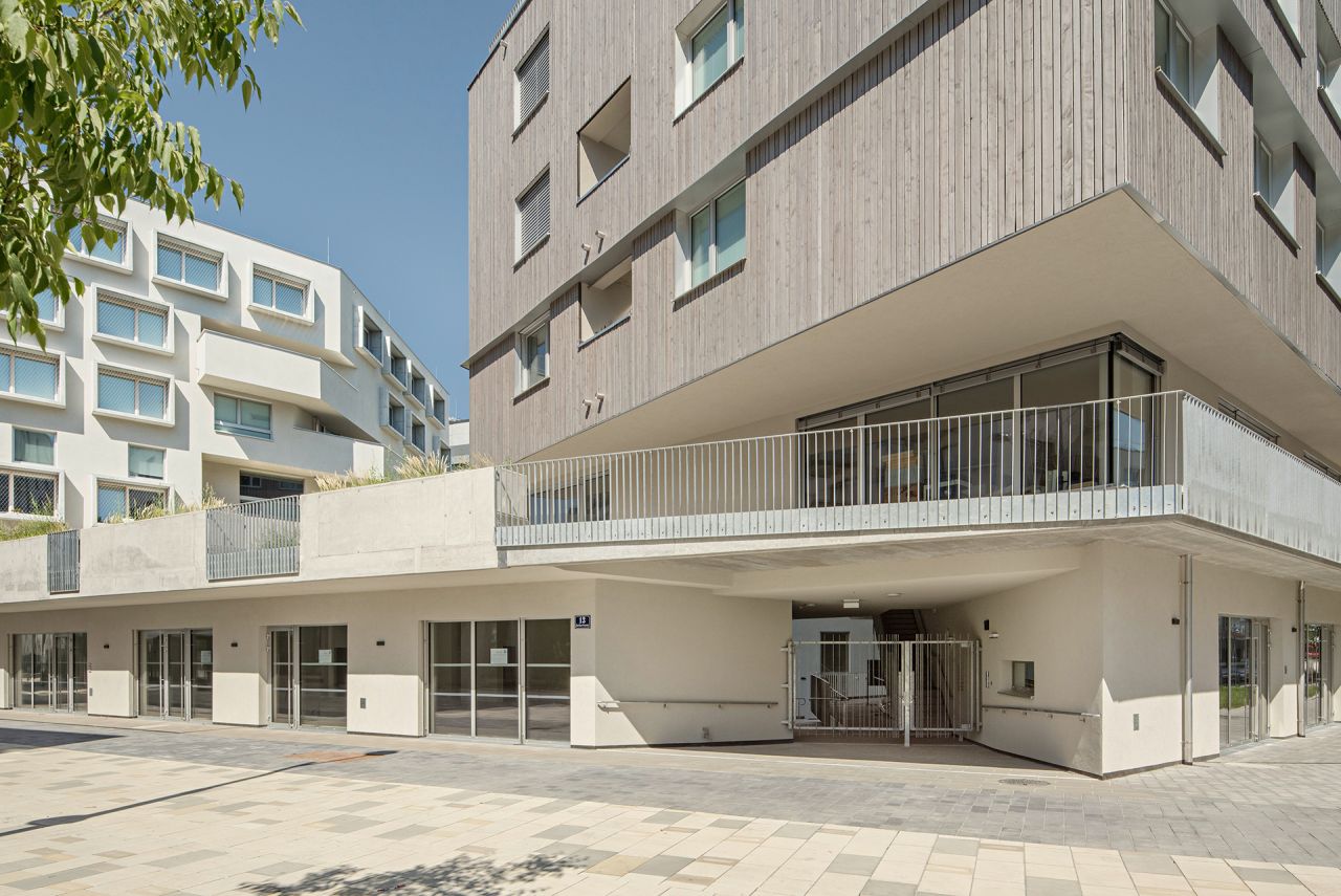 The Quartiershaus "At the City Balcony" consists of the collective housing group house (transparadiso) and the +haus (feld72). It was specially designed for the Quartierhaus area in the 10th district in the immediate vicinity of the main station adjacent to the Helmut Zilk Park. By combining two construction fields, a "backyard situation"/adjacent to the parking garage was avoided and instead the "city balcony" was created as a generous open space for the users on level +1, which opens the view to the Helmut-Zilk-Park.