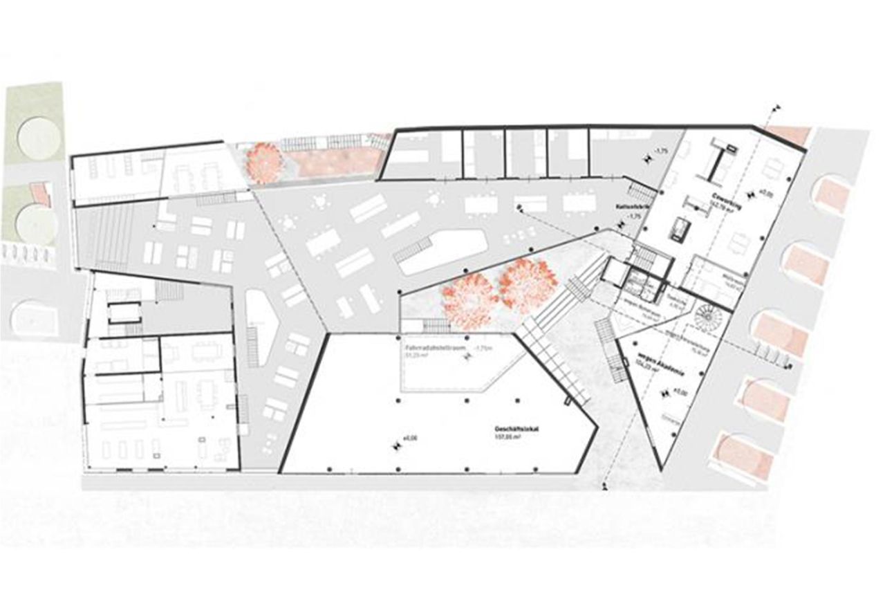 The urban ground floor zone with the „urban workshop area“ is aimed at entrepreneurs and associations looking for shared use in a communicative and innovative working environment. The „city balcony“ above connects the two parts of the building and links all uses and functions as semi-public space. From here, new perspectives are opened up on the promenade, Helmut-Zilk-Park and the young city.
