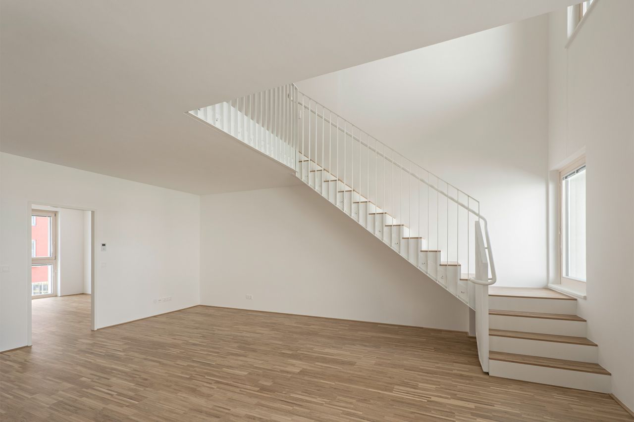 The residential group house was planned with and for the "Wohngruppe am Stadtbalkon". A variety of different apartment types, developed according to the wishes of the future residents, are connected via an open, communicative access area as communal space. The top floor houses small apartments that will be rented to people with short-term housing needs and integrated into the housing community.