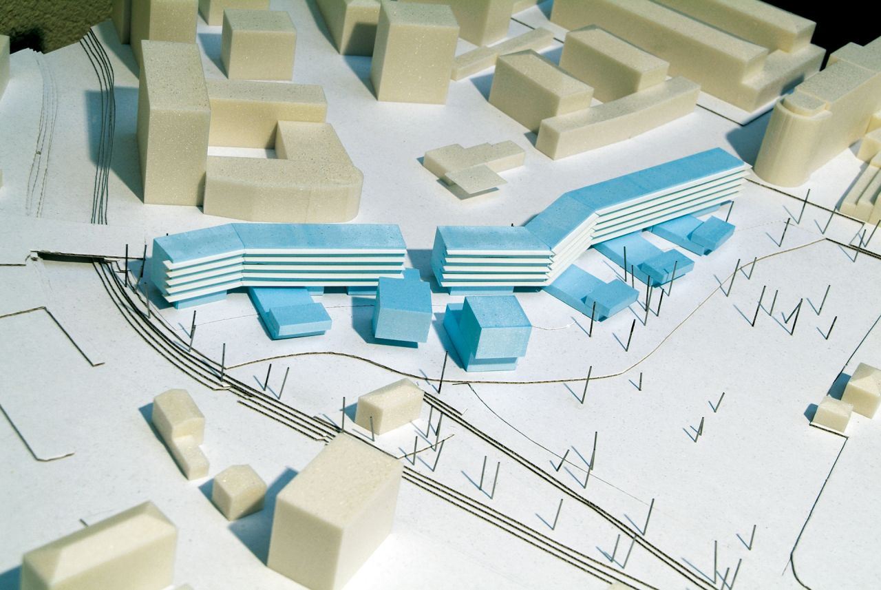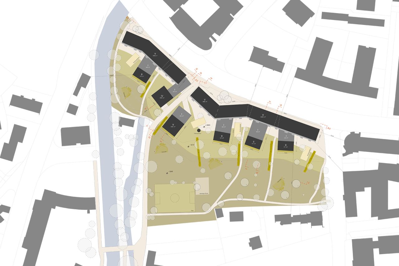Ein langer, entsprechend den städtebaulichen Gegebenheiten „geknickter“, fünf-geschoßiger Nord-Süd-Riegel schützt schalltechnisch den Bauplatz und offeriert gleichzeitig im Erdgeschoß einen urbanen Filter. Eingänge, Durchblicke, Durchgänge und einzelne urbane Nutzungen sowie Fahrradabstellplätze suchen die Verbindung zwischen Freiraum und Ignaz-Harrerstrasse. Im Bereich der Glan knickt der Baukörper ein weiteres Mal, sodass einerseits städtebaulich das