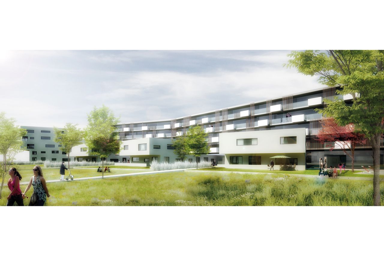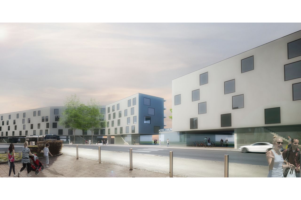 Der neue Wohnbau mit Hotel setzt einen städtebaulichen und architektonischen Akzent an der Ignaz-Harrer-Strasse und öffnet sich zum Grünraum und dessen natürräumlichen Qualitäten.