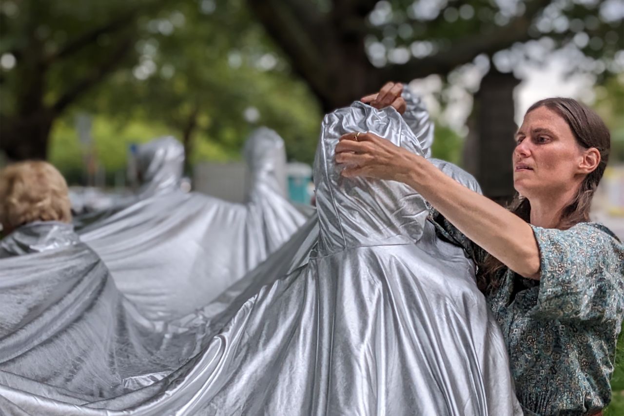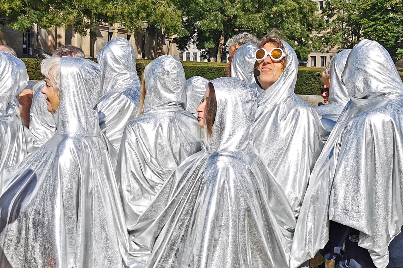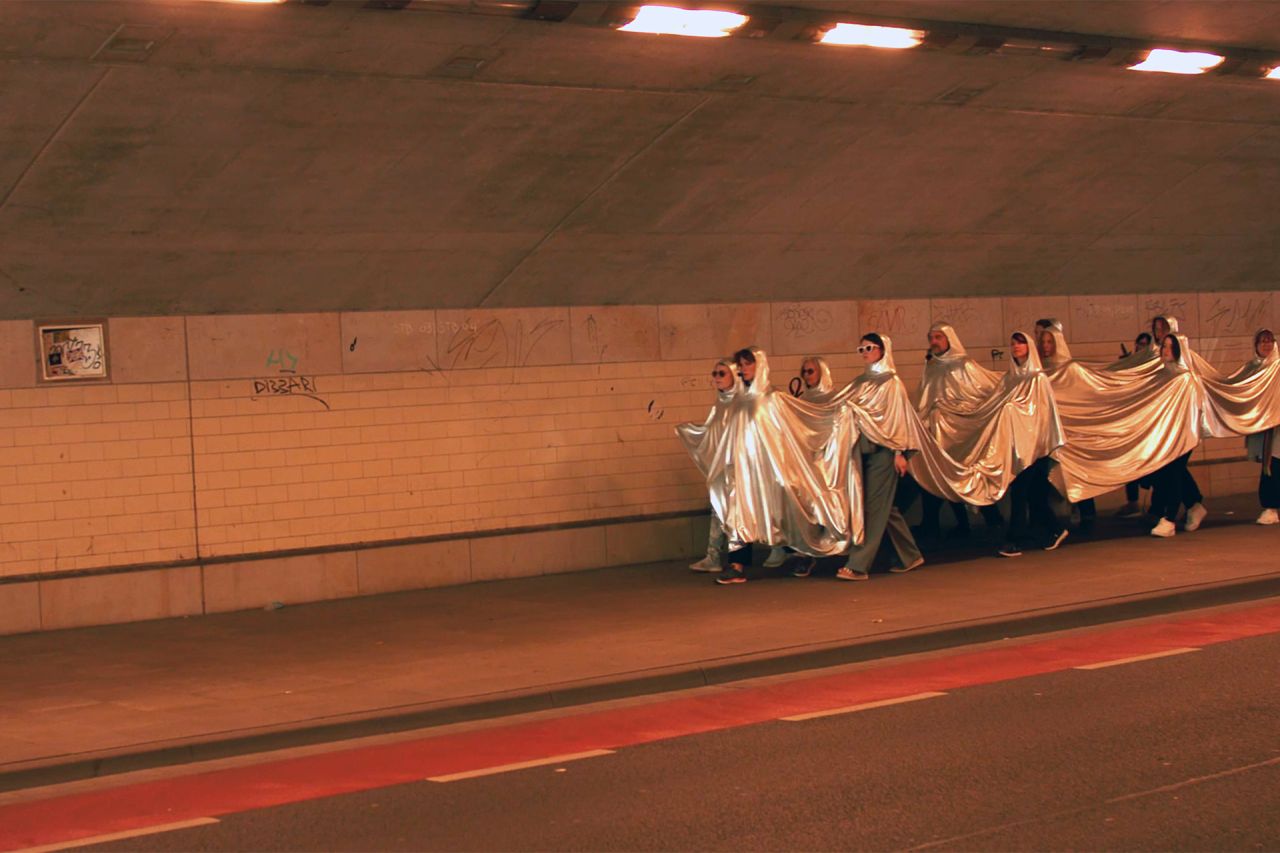 Transparadiso inszeniert mit Togetherhood eine Parade des Leisen - im Sinne von "Stillem Aktivismus": Innehalten, Staunen, Stille, Ruhen, in sich selbst Ausschweifen. Die silberne Decke regt einen makro-utopischen Raum in der Vielheit an, in dem die „gläserne Decke“ von Machtstrukturen und sozialer Ungleichheit hinterfragt wird und zukünftige Fiktionen von Gemeinschaften Platz haben – über Grenzen hinweg, trotz aller Konflikte, von denen unsere Gesellschaft und die Welt derzeit geprägt sind.